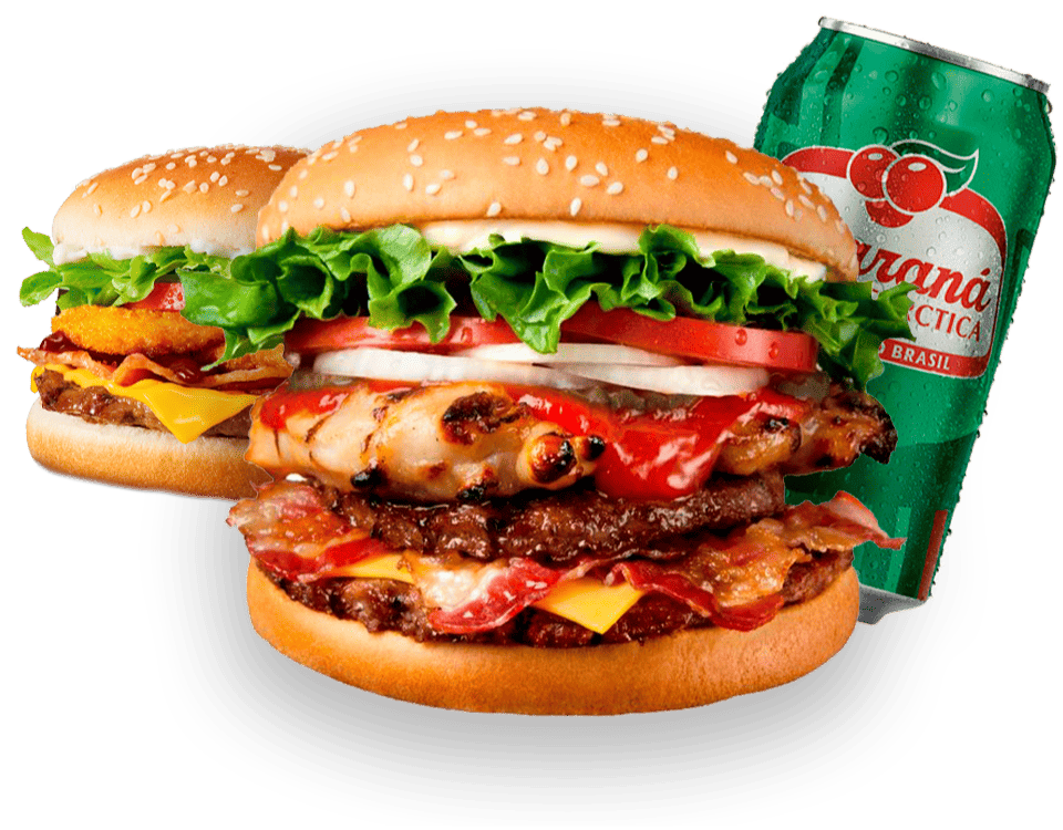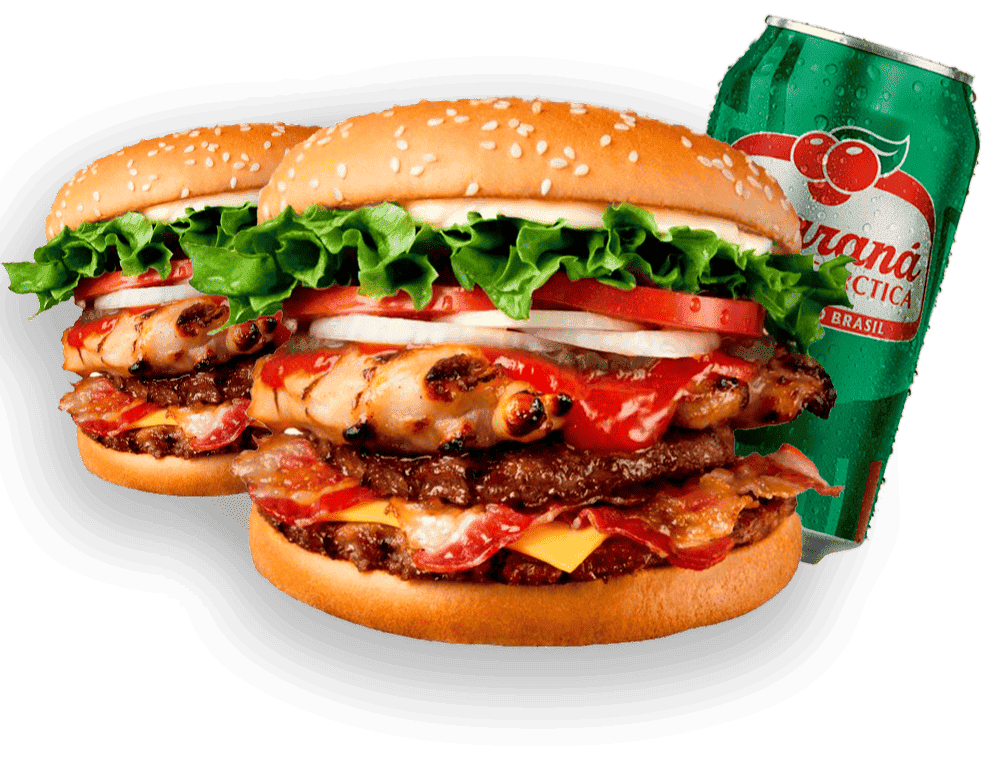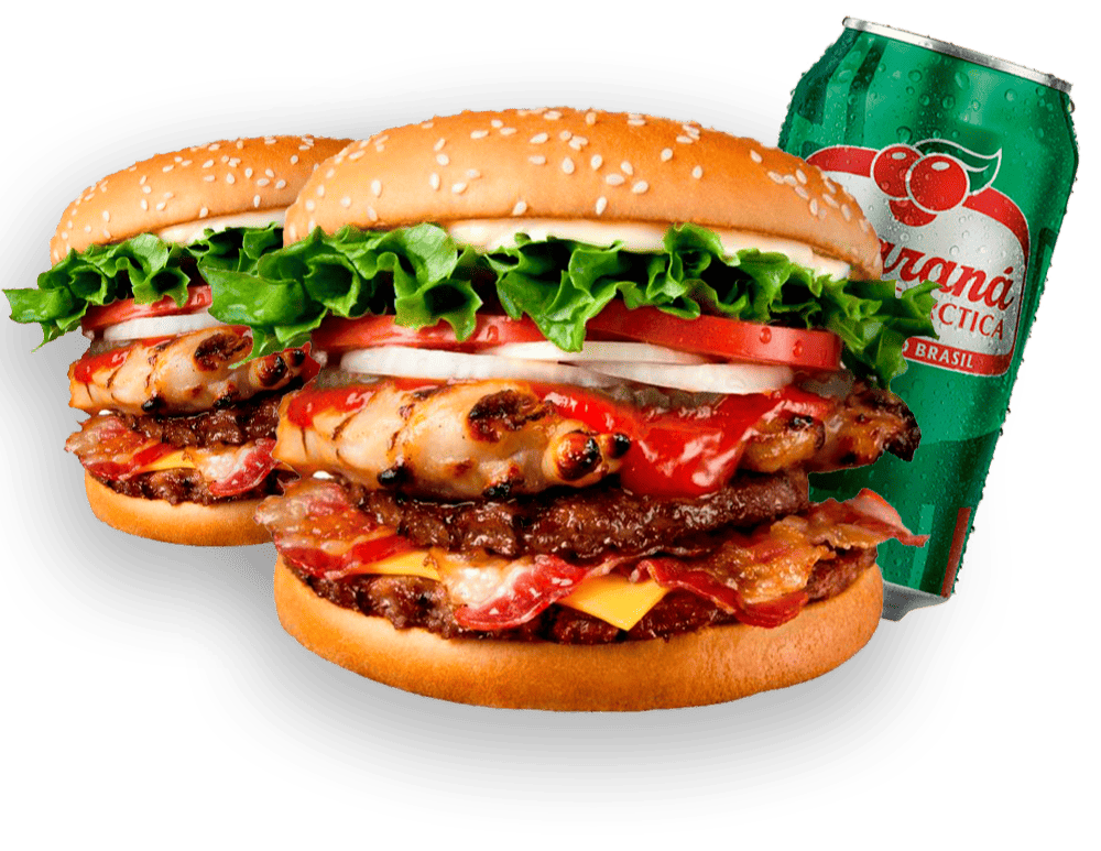 Carne de hamburguer, filé de frango, calabresa, queijo mussarela, alface, tomate, batata palha, picles de pepino, molho garagge.